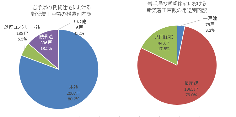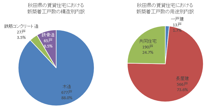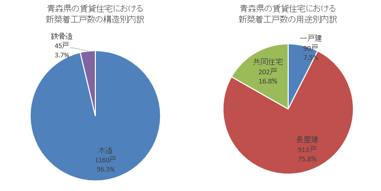 用途別の内訳を見ると、青森県と同じく長屋建てが最も多く1965戸、共同住宅443戸、一戸建て79戸と続きました。新規着工した賃貸住宅全体のうち79.0%が長屋建てという結果です。