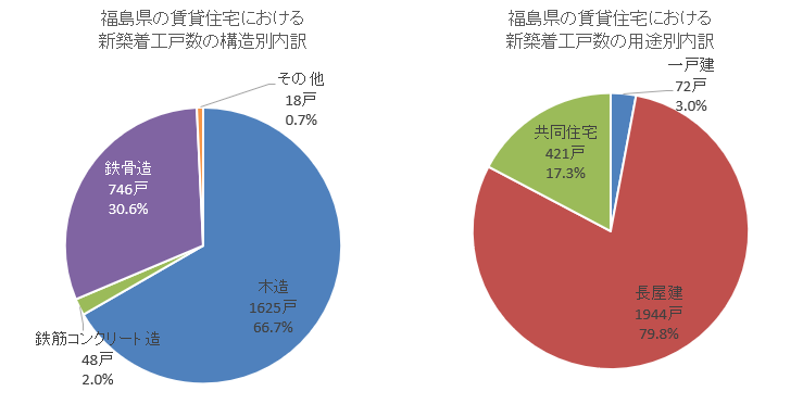 構造別に見ると木造が1625戸で、東北エリア内の他県と同様に最多であった一方、鉄骨造が746戸と3割を超えたのは福島県のみでした。