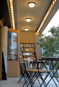代表の今井健太氏が話す。「実はこの上が全部で53席の映画館になっていてその座席の形なんですよ。また、こういったミニシアターは中が見えなくて入りづらい雰囲気のところが多いんです。その課題を解決するため、1階をガラス張りのカフェにして外からも見えやすく、気軽に立ち寄ってもらえるようにしました」。