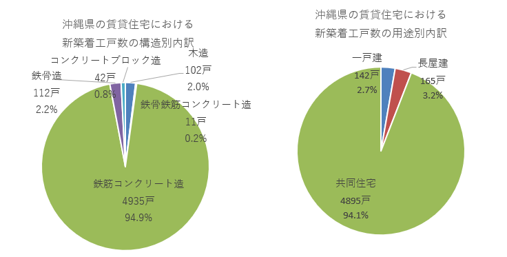 賃貸住宅の構造別に見ると、鉄筋コンクリート造が4935戸で構成割合が94.9%となり最多。次いで鉄骨造が112戸、木造は102戸、鉄骨鉄筋コンクリートが11戸の順でした。九州沖縄エリアでは鉄筋コンクリート造の占める割合が突出していました。