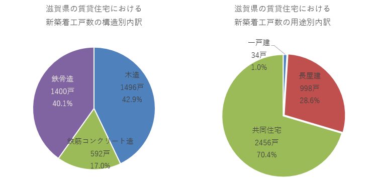 構造別では木造が1496戸、鉄骨造が1400戸とそれぞれ4割を占めたほか、鉄筋コンクリート造が592戸で17.0%となりました。建て方別の内訳では、共同住宅が構成比70.4%、長屋建てが28.6%でした。