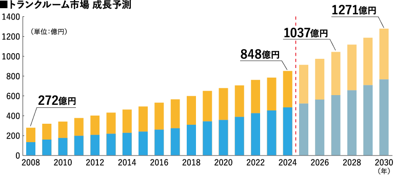トランクルーム市場は、都市部を中心とした住環境の変化を背景に、近年継続的な拡大を続けている市場だ。屋内トランクルーム事業を展開するキュラーズの調査によれば、日本のトランクルーム市場(屋内型・屋外型を含む)は2008年の調査開始以降、16年連続で成長しており、24年には市場規模が約850億円に到達した。さらに今後も堅調な成長が見込まれており、27年には1000億円規模に達する可能性があると予測されている。