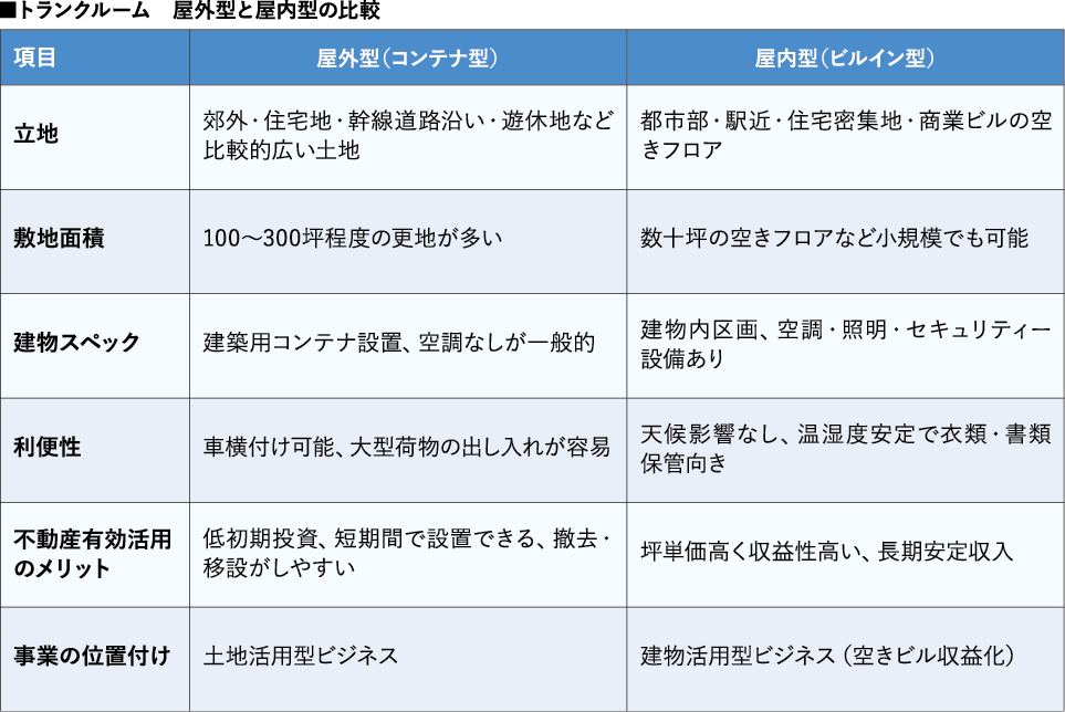 トランクルームには、コンテナを利用した屋外型と建物内にある屋内型の2タイプがある。