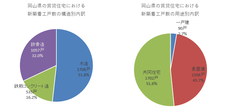 岡山県の24年の賃貸住宅着工数は3300戸で、中国・四国エリアの中では17.7%という構成割合でした。岡山県の新築着工総戸数9266戸に対しては35.6%となっています。また、岡山県の新築着工総戸数が前年度比で10.0%の減少となる中、賃貸住宅は前年度比で7.7%とひとケタの減少にとどまりました。