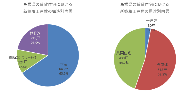 島根県の24年の新築賃貸住宅着工戸数は982戸となり、1000戸に届きませんでした。県全体の新築着工戸数における割合としては33.7%でした。前年度比では15.9%減と、2ケタの減少幅となりました。