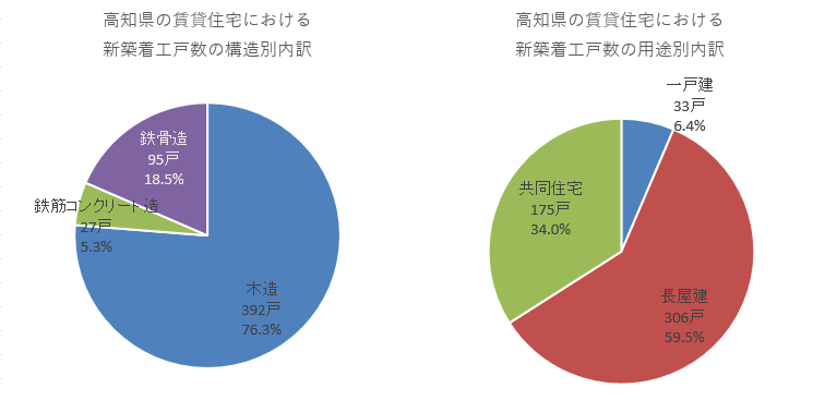 構造別内訳を見ると、木造が新築賃貸住宅着工数の76.3%となる392戸で最多。鉄骨造が95戸、鉄筋コンクリート造が27戸となっています。